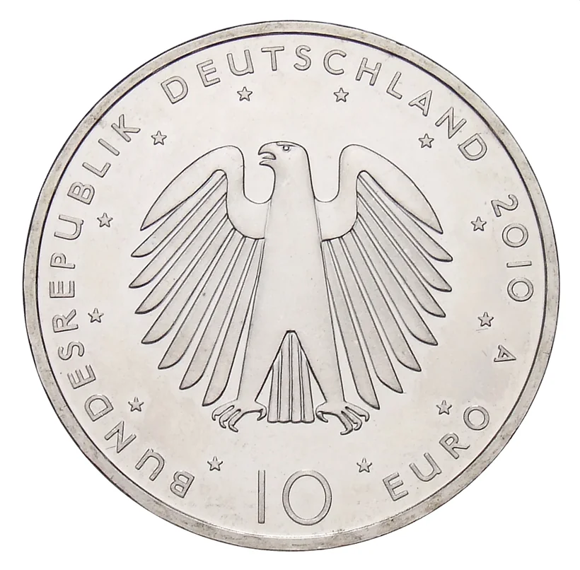 Description: The stylized German eagle, encircled by twelve EU stars, is accompanied by the text "BUNDESREPUBLIK DEUTSCHLAND", the year, the Berlin mint mark "A", and the face value "10 EURO".