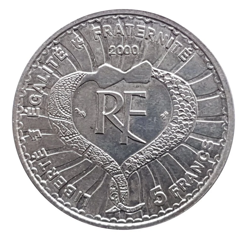 Circular legend: "LIBERTE EGALITE FRATERNITE" and value. Year above. Central "RF" in a heart-shaped jewel.