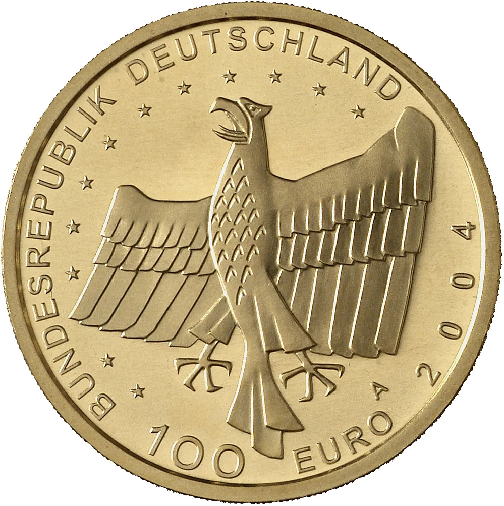 German federal eagle within EU stars, "BUNDESREPUBLIK DEUTSCHLAND", year, "100 EURO", and mintmark.