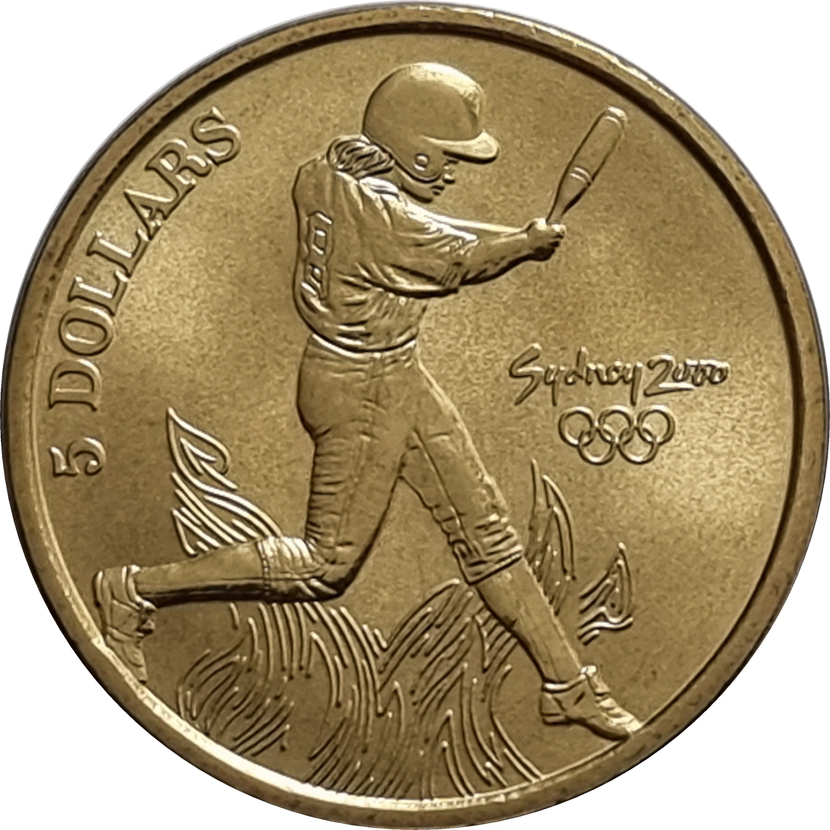 A softball player in mid-swing, with the Sydney 2000 logo and Olympic rings beside it.