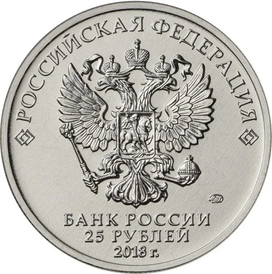 Central relief of the Russian Federation State Coat of Arms. Above it, a semicircular inscription "РОССИЙСКАЯ ФЕДЕРАЦИЯ" framed by doubled rhombuses. Below, "БАНК РОССИИ", "25 РУБЛЕЙ", "2018 г.", and the mint mark to the right.