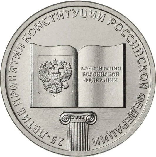 A relief image of an open book: the left page shows the Russian Coat of Arms, the right has the engraved inscription "КОНСТИТУЦИЯ РОССИЙСКОЙ ФЕДЕРАЦИИ." Below is the top of an Ionic column. Around the circumference is the inscription "25-ЛЕТИЕ ПРИНЯТИЯ КОНСТИТУЦИИ РОССИЙСКОЙ ФЕДЕРАЦИИ."