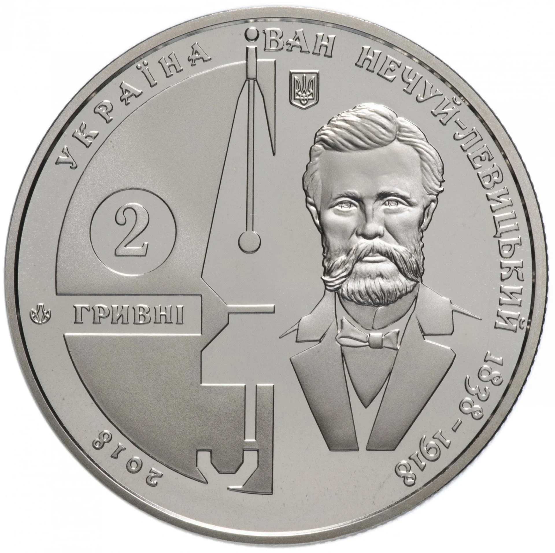 The coin features Ukraine's small coat of arms at the top. On the right is a portrait of Ivan Nechui-Levytskyi beside a stylized umbrella resembling a quill. The left side shows the face value "2/ГРИВНІ" and the mint mark. Circular inscriptions read "УКРАЇНА" and "ІВАН НЕЧУЙ-ЛЕВИЦЬКИЙ 1838–1918". The mintage year "2018" is at the bottom left.