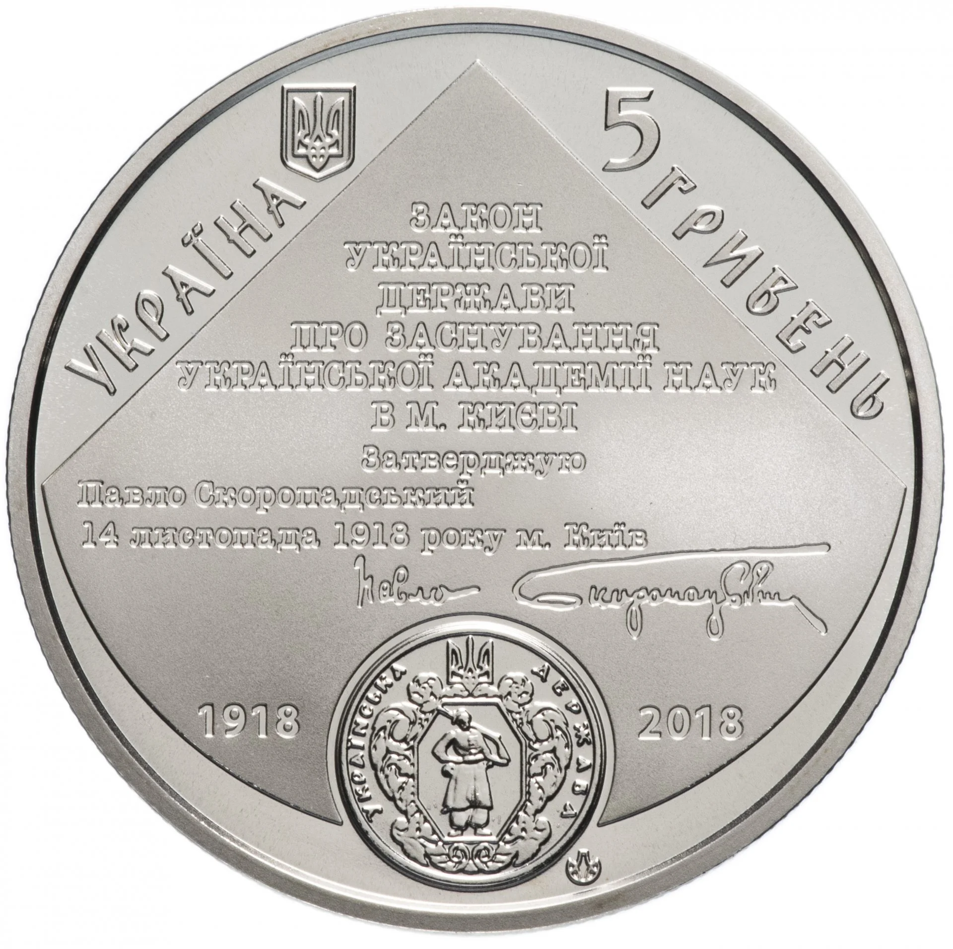 Ukraine's small coat of arms and the word "УКРАЇНА" are at the top left. At the top right is the face value "5 ГРИВЕНЬ." Centered on a matt background is the text of the law establishing the Ukrainian Academy of Sciences in Kyiv, approved by Pavlo Skoropadskyi on November 14, 1918, with his facsimile signature below. Beneath that is the state stamp flanked by the years 1918 and 2018, along with the mint mark.
