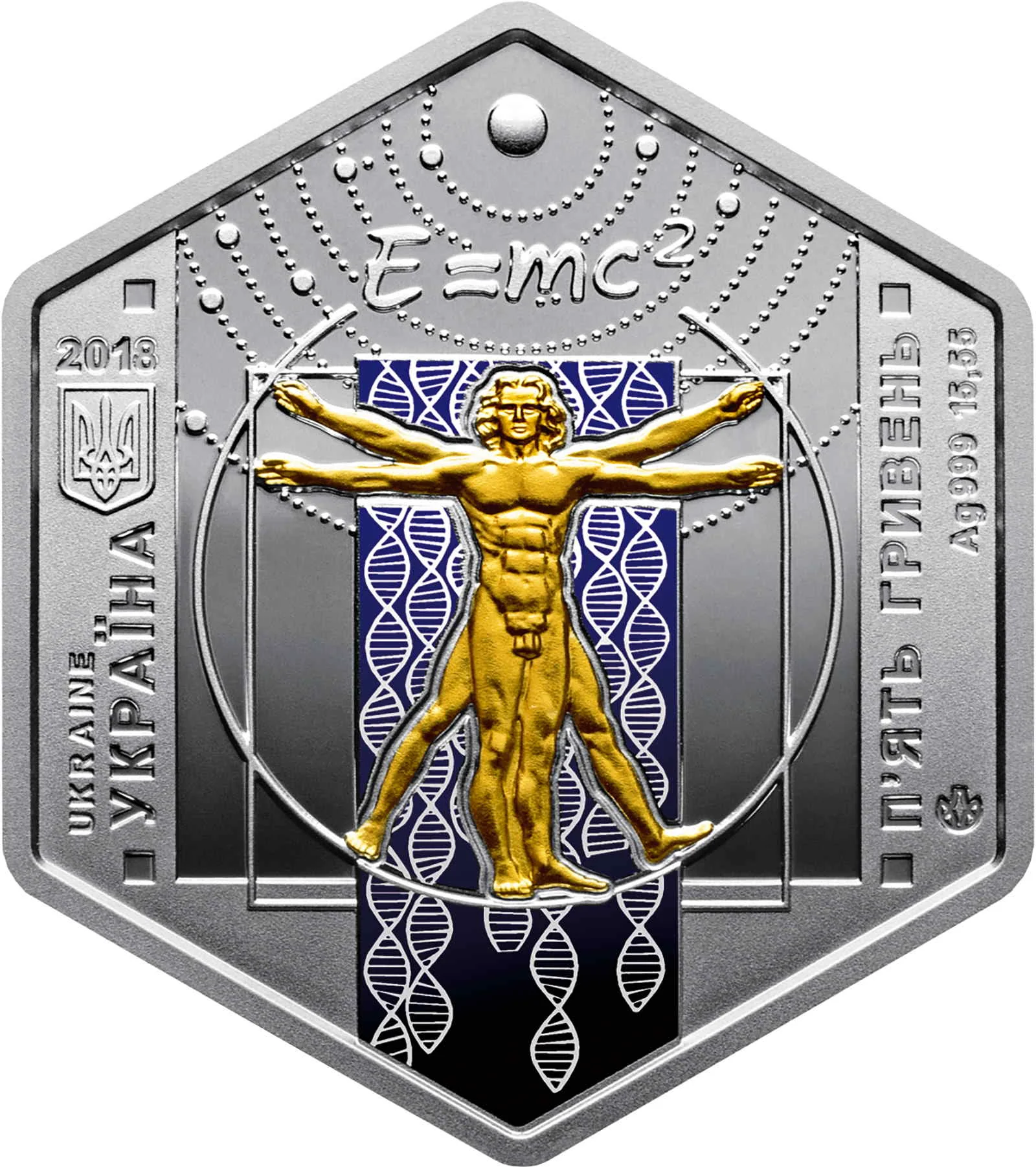 Left: 2018, Ukraine's coat of arms, and "UKRAINE/УКРАЇНА". Right: face value "5 HRYVEN", "Ag 999 15,55", and the mint mark. Central background: a stylized heliocentric model with Einstein's E=mc². Below: da Vinci's Vitruvian Man (gilded) on a violet background with a double helix pattern.