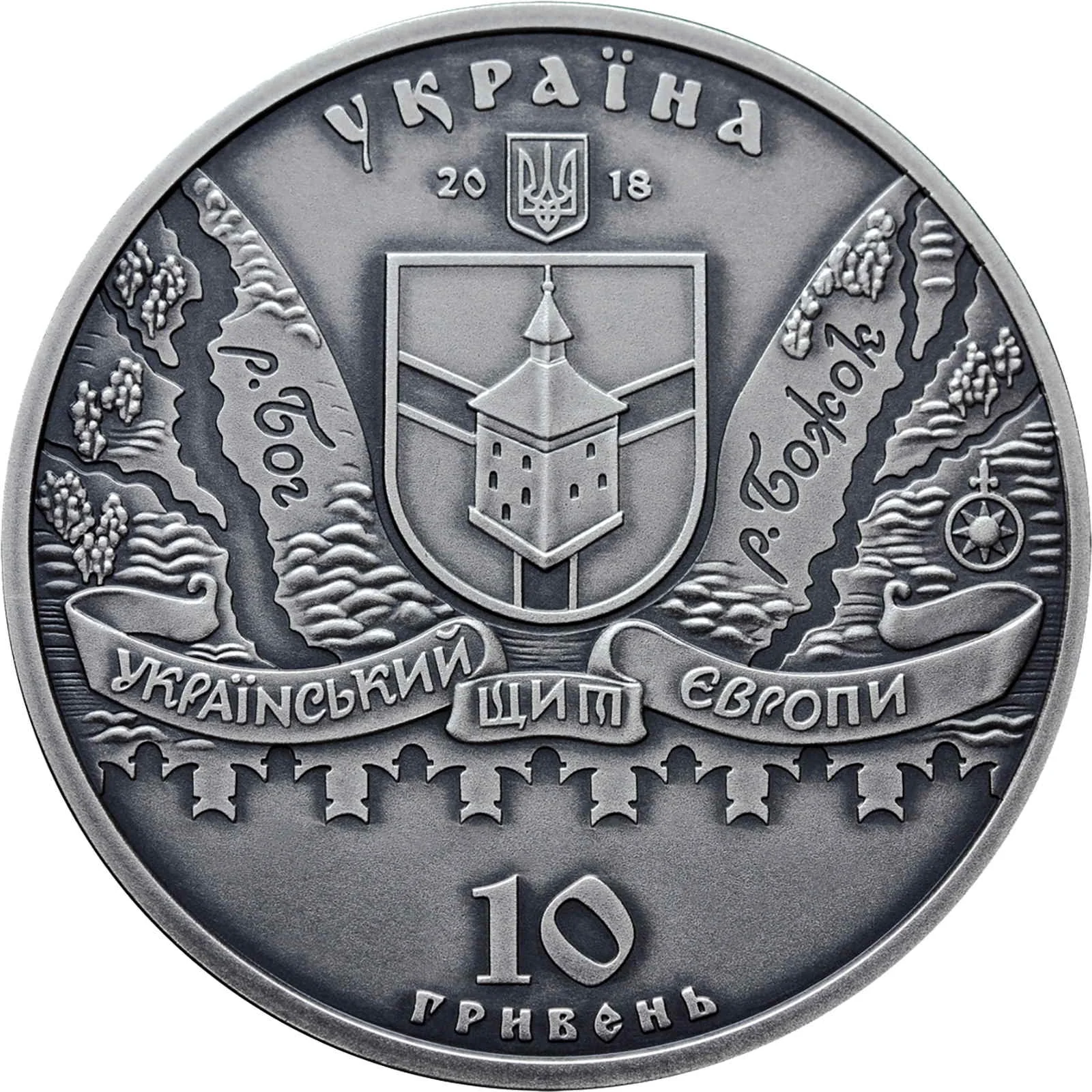The obverse features "УКРАЇНА" above Ukraine's small coat of arms, flanked by 20 and 18. The central shield depicts a tower beside stylized maps labeled "р. Бог" and "р. Божок." Below is the inscription "УКРАЇНСЬКИЙ ЩИТ ЄВРОПИ," with the face value "10 ГРИВЕНЬ" on a merloned background.