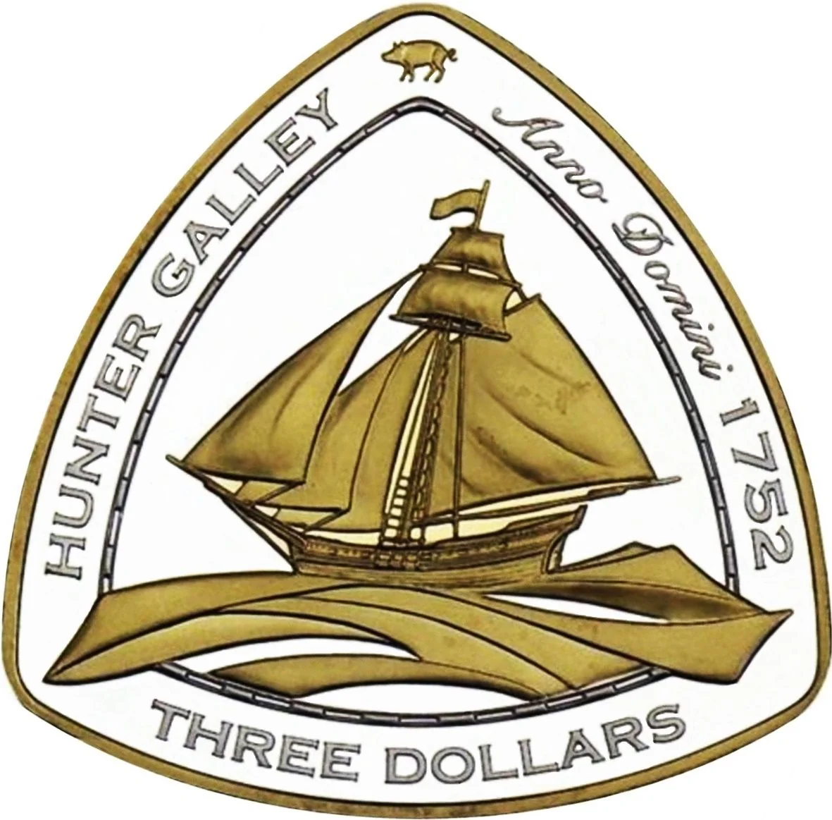 Gold-plated "Hunter Galley" in knotted frame, with boar above and denomination below.