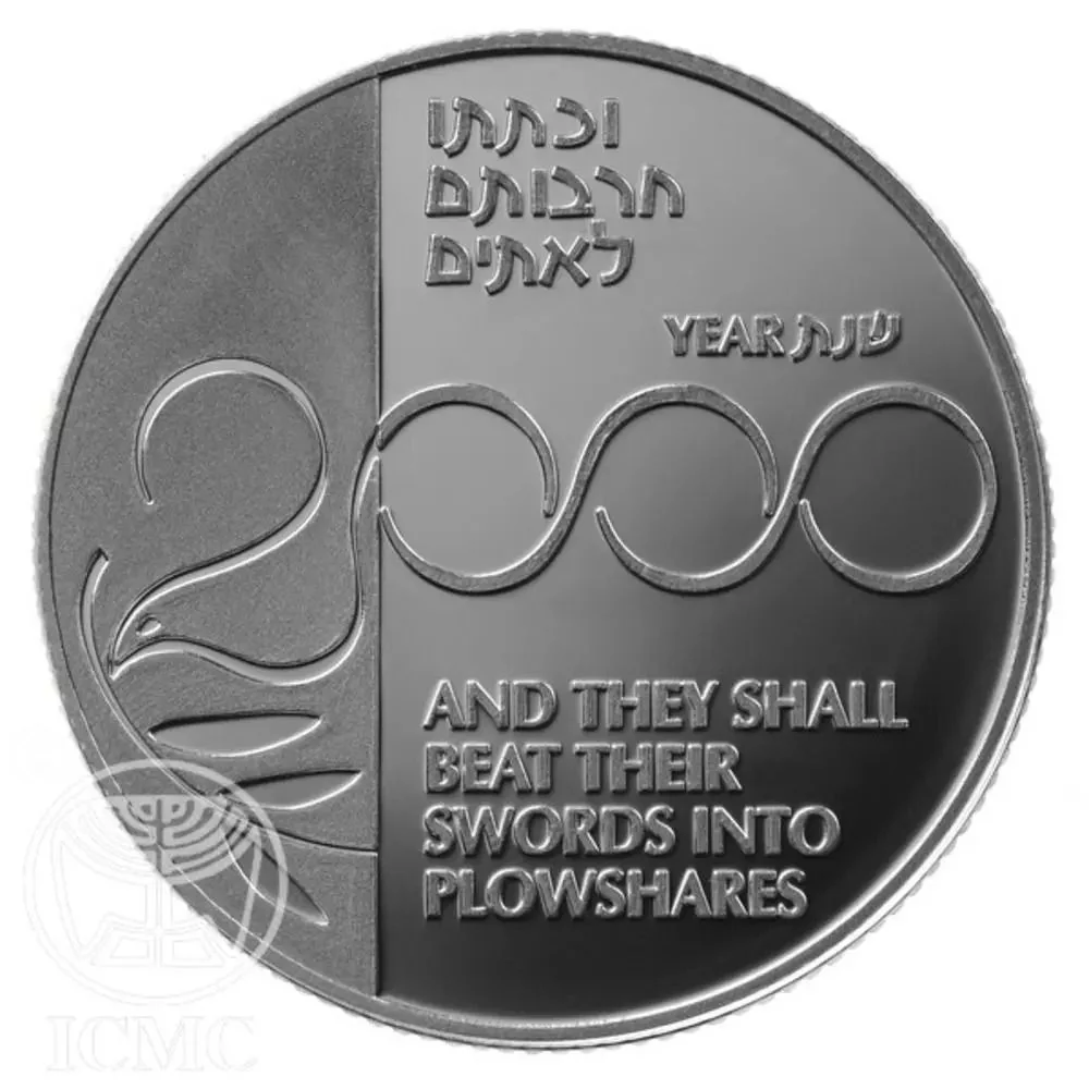 A dove-shaped "2" on a matte field overlooks an olive branch. To its right, three shiny zeros bear the word "YEAR." The verse Isaiah 2:4, "AND THEY SHALL BEAT THEIR SWORDS INTO PLOWSHARES," is inscribed below in English and above in Hebrew.