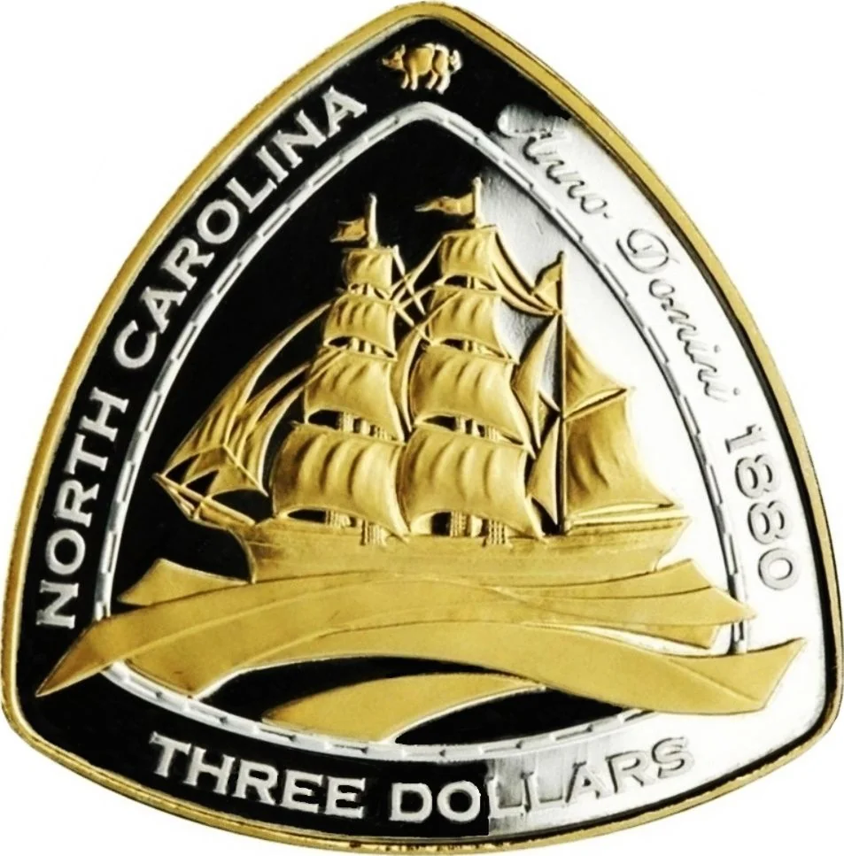 Gold-plated "North Carolina" image with a small wild hog above.