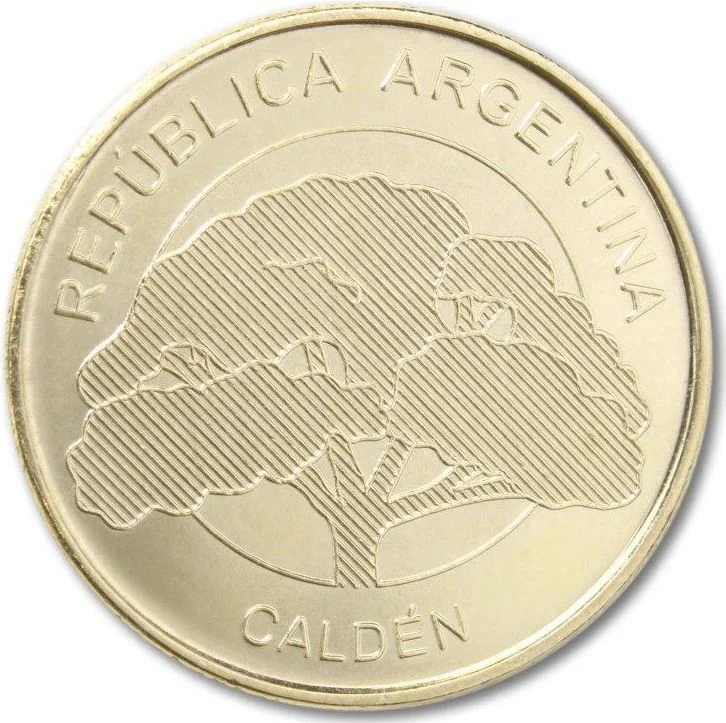 A stylized caldén tree, a species unique to Argentina with a broad, rounded canopy, centered between the upper text "REPÚBLICA ARGENTINA" and the lower text "CALDÉN."
