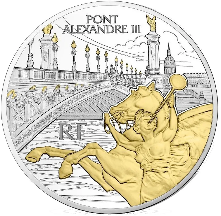 The Alexander III Bridge over the Seine, viewed from the right bank, with a close-up of a Fame figure and Pegasus in the foreground.