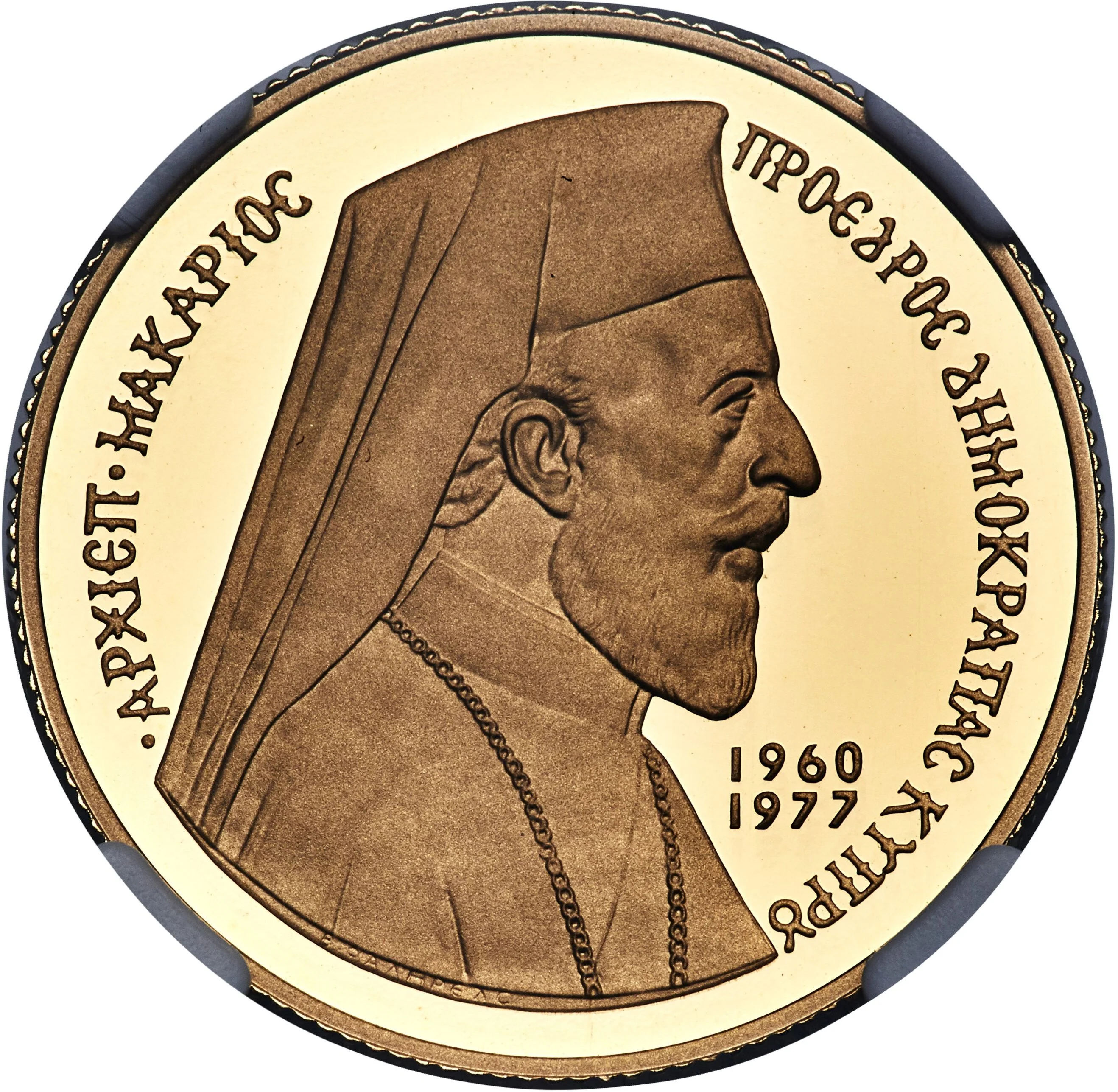 Description: Portrait of Archbishop Makarios facing right, encircled by a Greek inscription naming him Archbishop and President of the Republic of Cyprus, with the dates 1960-1977.