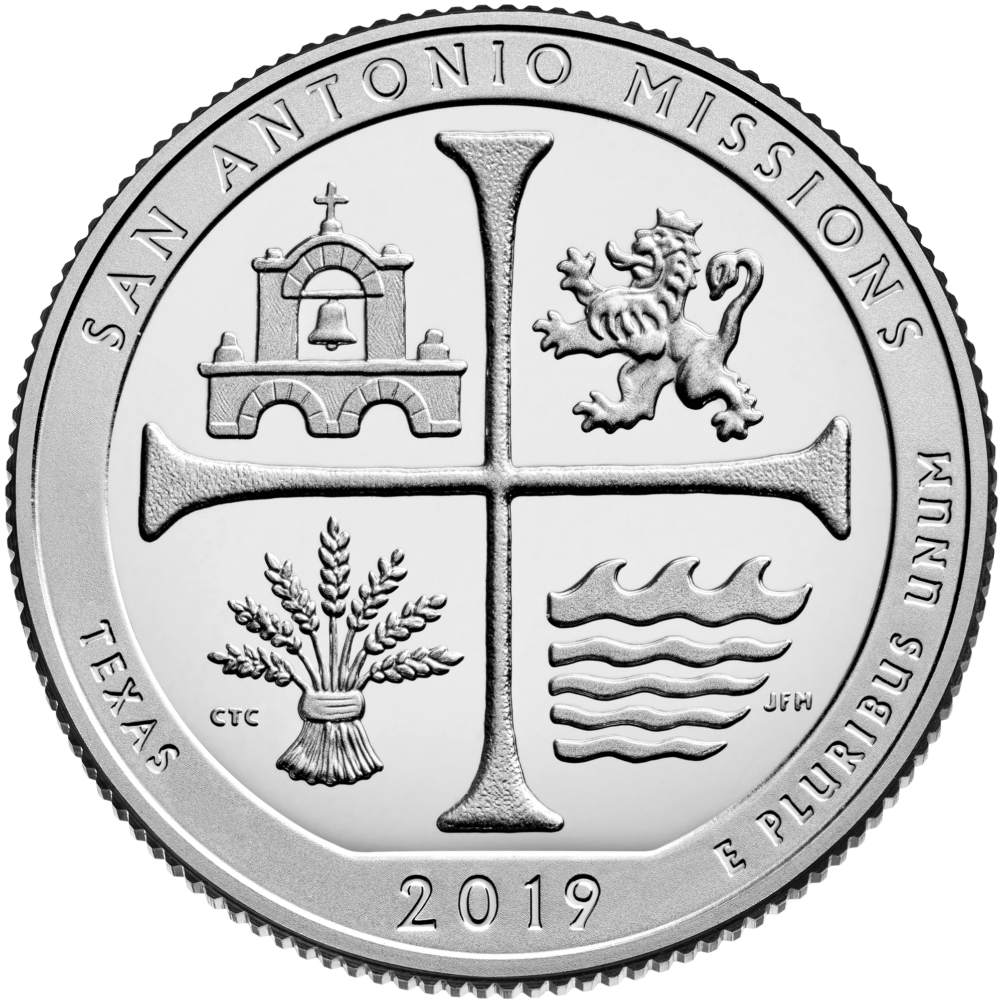The Spanish Colonial Real coin honors the missions with symbols in its quadrants: wheat for farming, arches and a bell for community, a lion for Spanish heritage, and the San Antonio River for irrigation and life.
