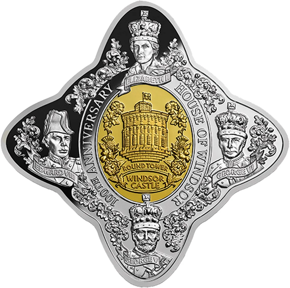 The coin depicts the four House of Windsor monarchs.