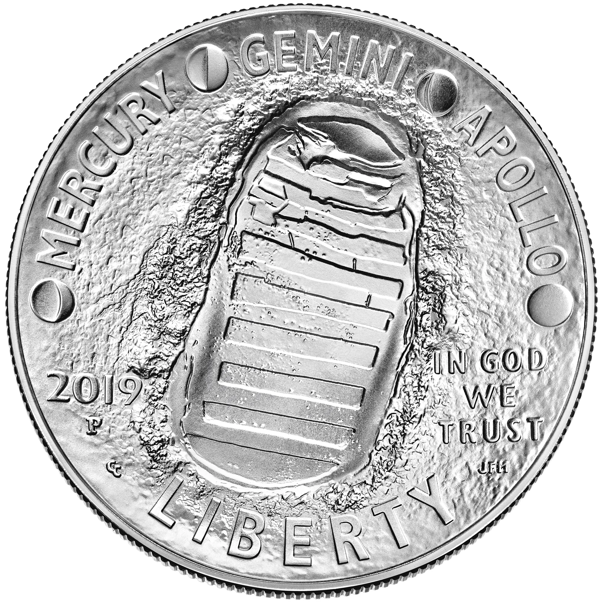 The obverse shows "MERCURY," "GEMINI," and "APOLLO" with Moon phases and a lunar footprint, symbolizing the U.S. space program's path to the first Moon landing.