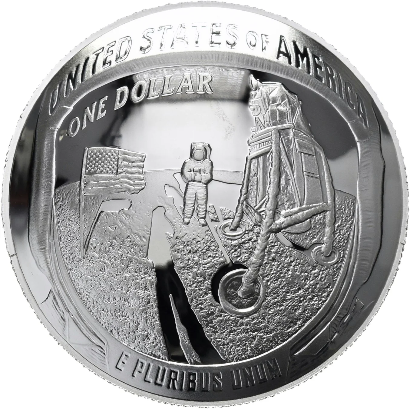 The obverse shows "MERCURY," "GEMINI," and "APOLLO" with Moon phases and a lunar footprint, symbolizing the U.S. space program's path to the first Moon landing.