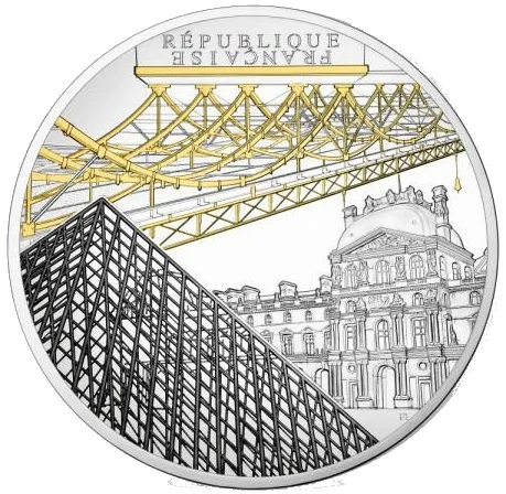 The obverse depicts the Louvre's Pavillon Richelieu, its pediment with caryatids, and I.M. Pei's glass pyramid (highlighted in rhodium on silver coins). "République française" appears when tilted. The Pont des Arts occupies the other half.
