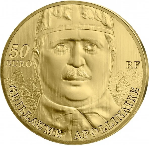 Portrait of the poet before fir trees, referencing his poem "Les Sapins," with face value and artist's name.