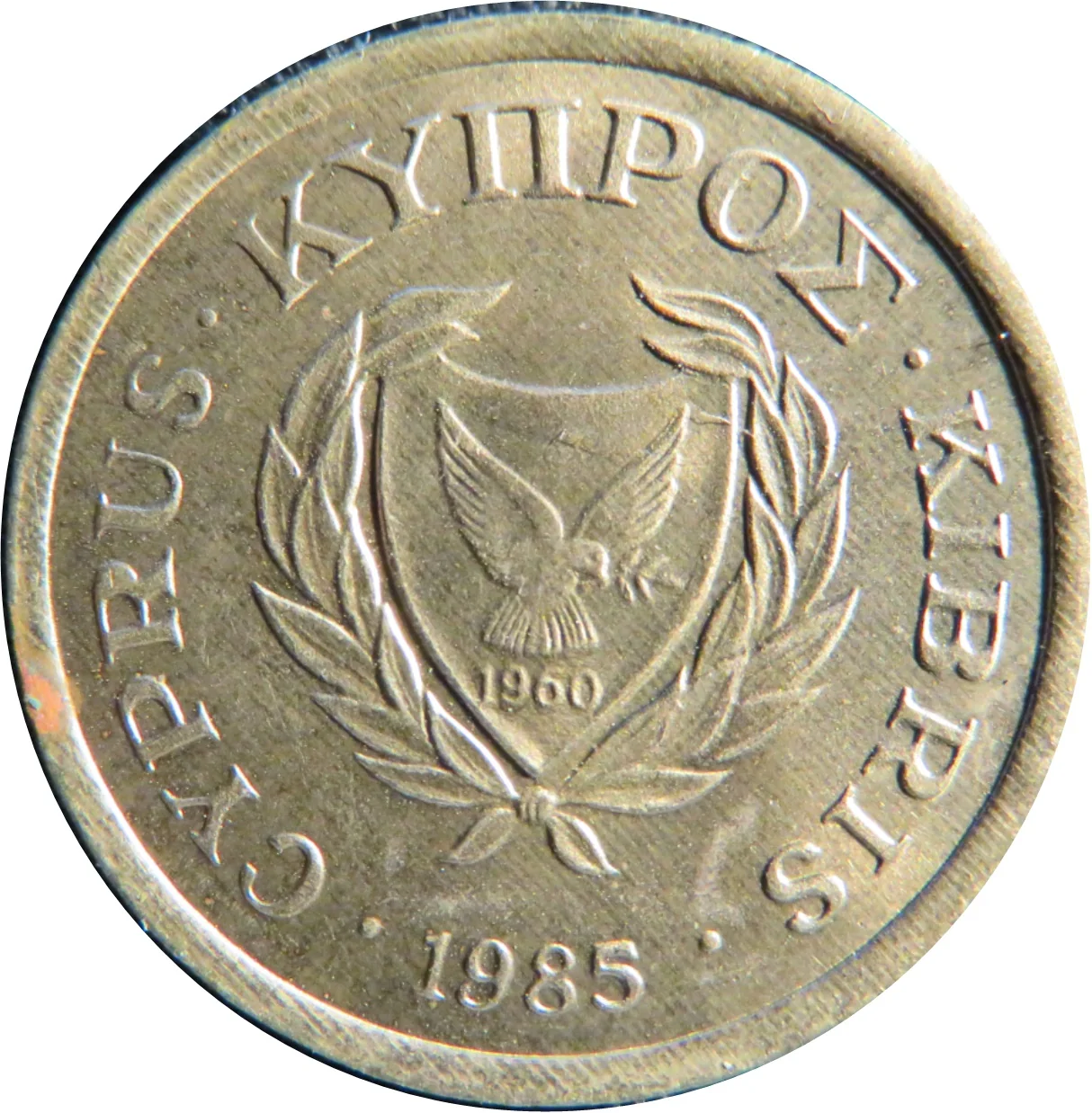 A dove with an olive twig over "1960," surrounded by laurels. "Cyprus" is written in Greek, Turkish, and English.