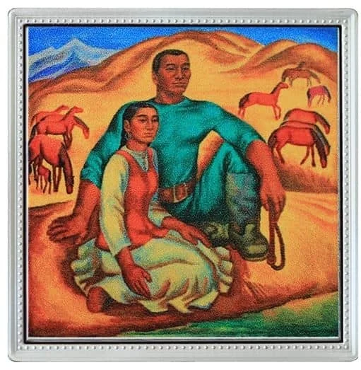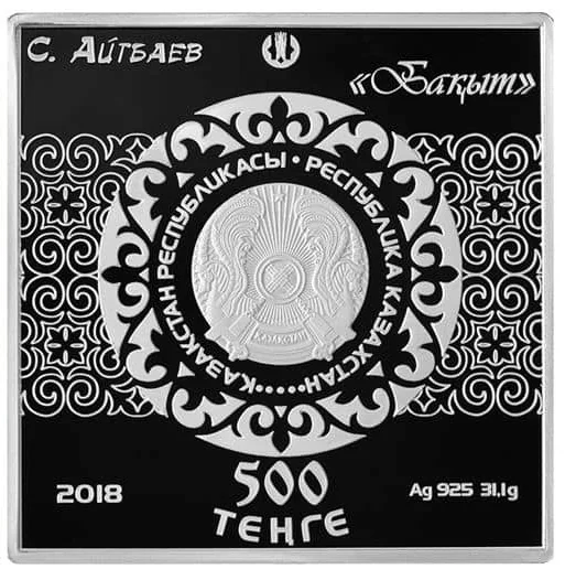 Description: The obverse features Kazakhstan's national emblem on an ornamental background, encircled by the country's name in Kazakh and Russian. Above is the National Bank logo, flanked by "С. АЙТБАЕВ" and "БАҚЫТ". Below is "500 ТЕҢГЕ", with the year "2018" to its left and "Ag 925" and "31,1g" to its right.