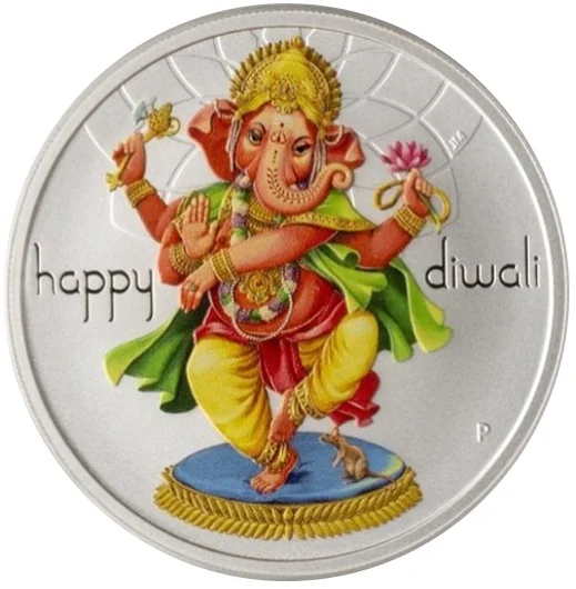 The reverse shows a colorized dancing Lord Ganesha, the designer's initials (Jennifer McKenna), and the Perth mintmark.