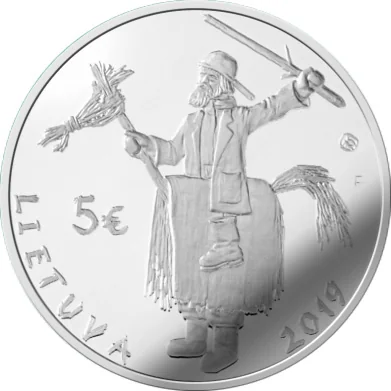 The coin's obverse depicts a Užgavėnės horse rider costume, along with the inscriptions LIETUVA, 2019, €5, and the Lithuanian Mint mark.