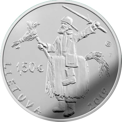 The coin's obverse depicts a Užgavėnės horse rider costume, along with the inscriptions LIETUVA, 2019, €1.50, and the Lithuanian Mint mark.
