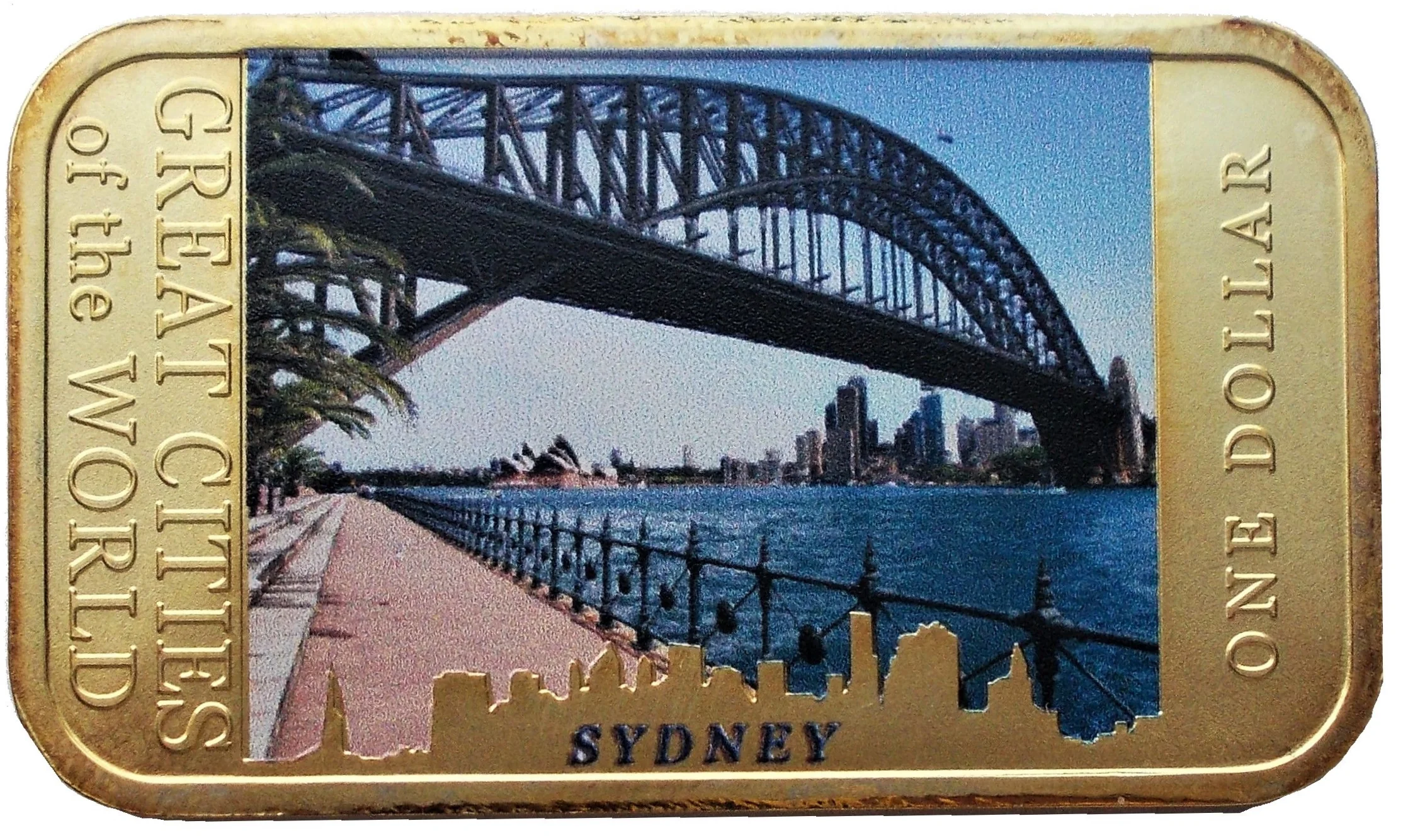 Photo of Sydney Harbour Bridge. "SYDNEY" below. "One Dollar" on right. "Great Cities of the World" on left.