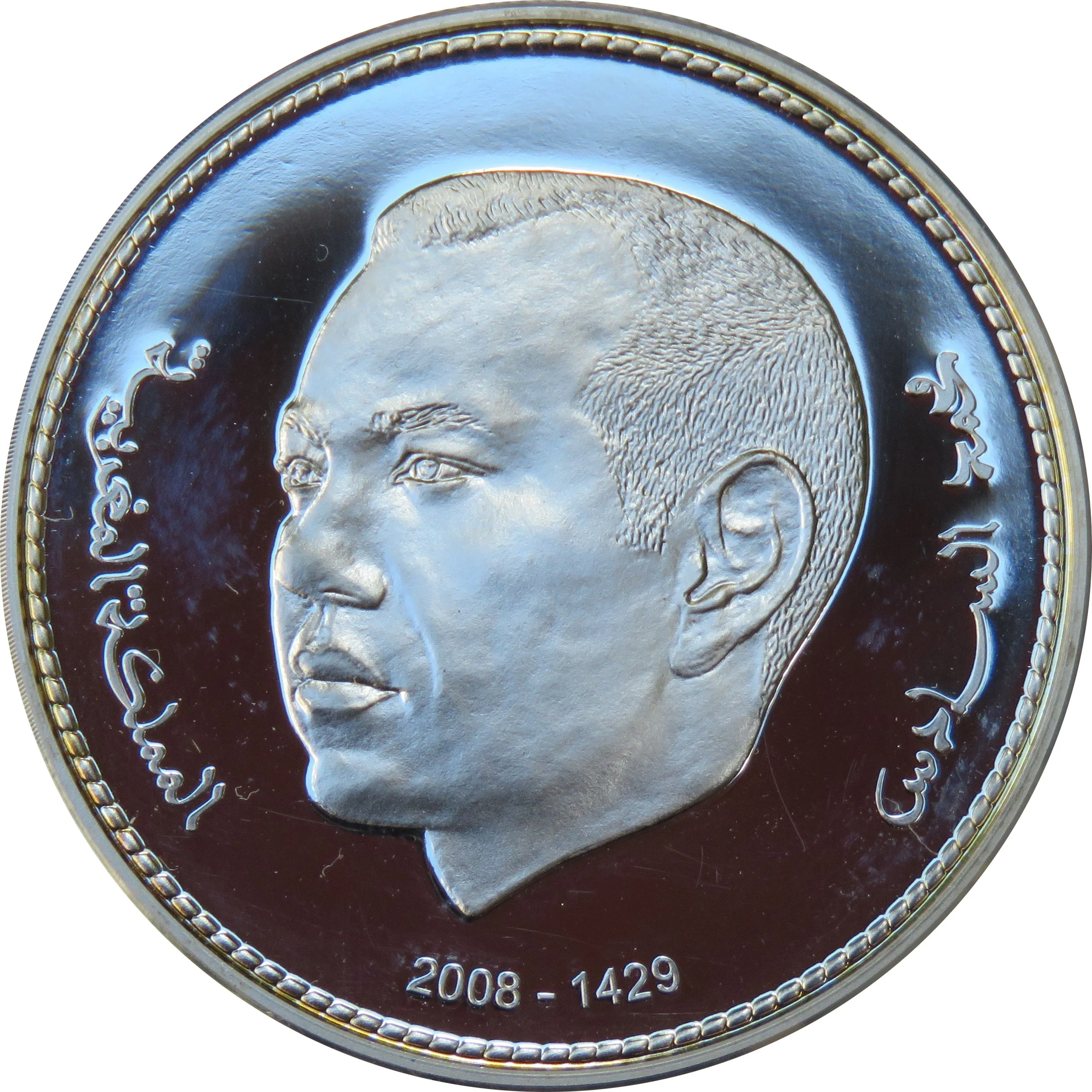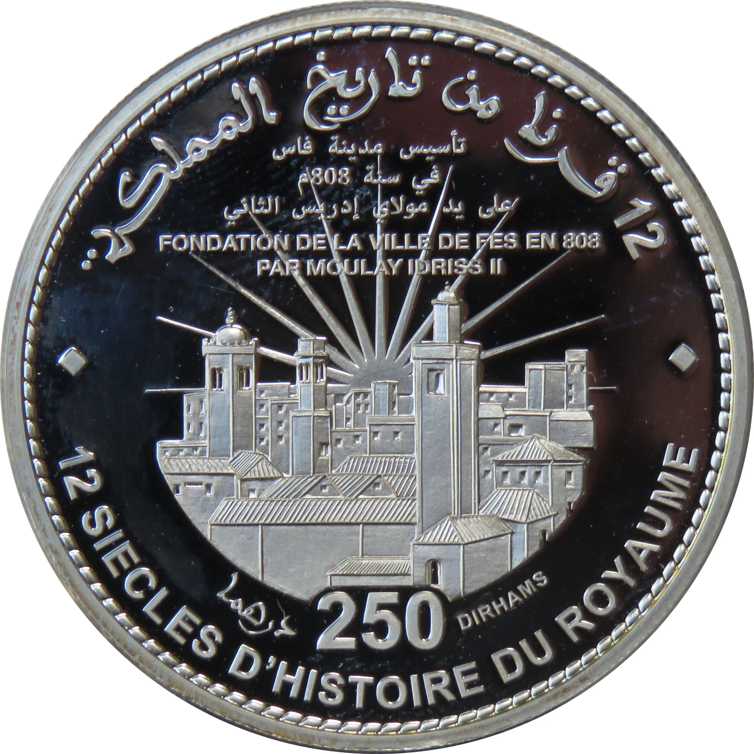 Description: Mosquées et bâtiments de Fès devant un soleil rayonnant, entourés de la valeur faciale et des légendes.