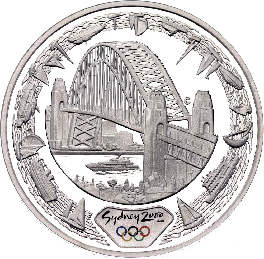 Sydney Harbour Bridge in wreath, Olympic logo below.