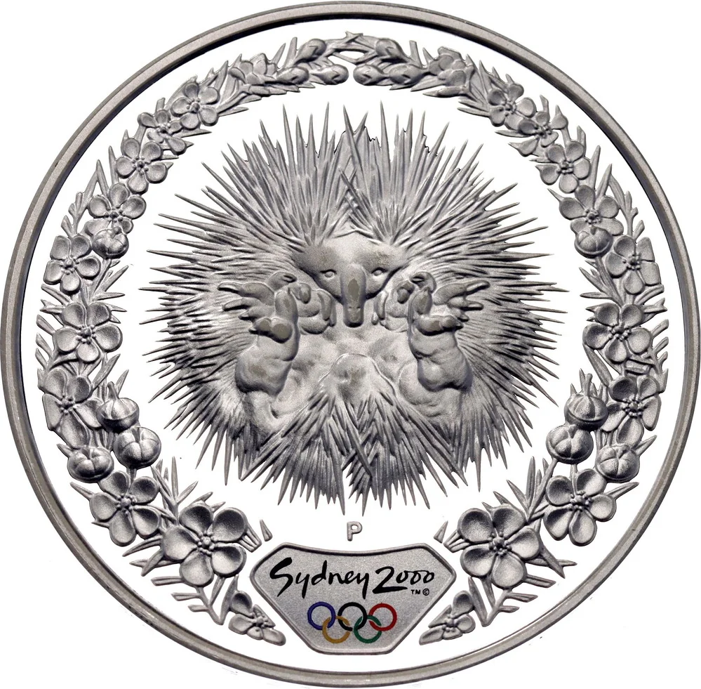 Echidna curled in a Tea Tree wreath, Olympic colors below.
