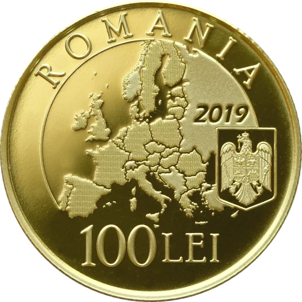 A 2019 map of the European Union marking Romania's Presidency of the Council, featuring the arched inscription "ROMANIA", the face value "100 LEI", Romania's coat of arms, and the year "2019".