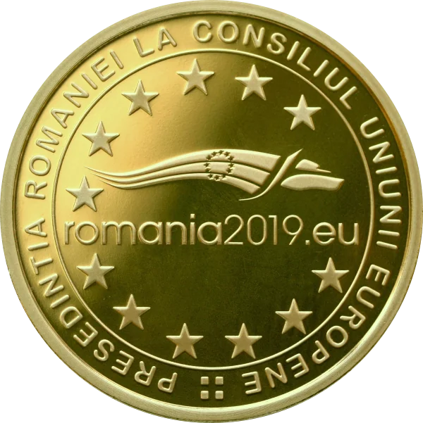 Romania's EU Council Presidency logo with the arched text "PRESEDINTIA ROMANIEI LA CONSILIUL UNIUNII EUROPENE."