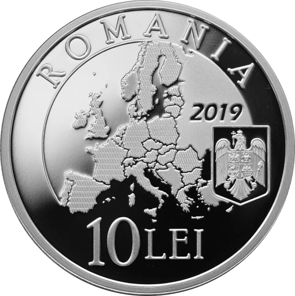 EU map as of 1 January 2019, when Romania holds the EU Council Presidency; with "ROMANIA" in an arc, "10 LEI", Romania's coat of arms, and "2019".