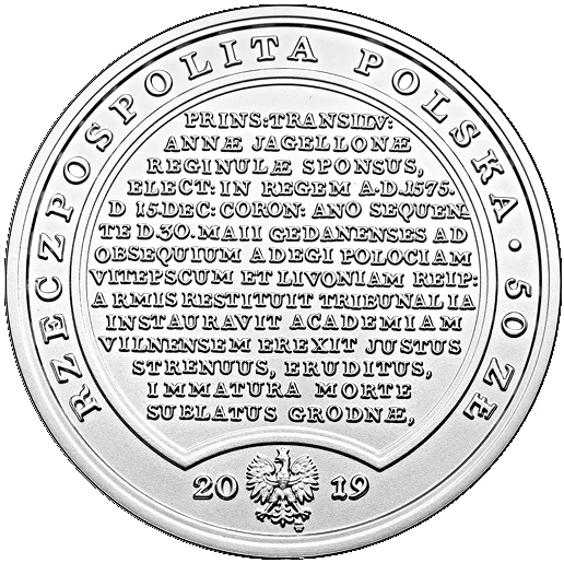 PRINS: TRANSILV: ANNAE JEGELLONAE REGINULAE SPONSUS, ELECT: IN REGEM A.D.1575. D 15.DEC: CORON: ANO SEQUEN-TE D.30.MAII GEDANENSES AD OBSEQUIUM ADEGI POLOCIAM VITEPSCUM ET LIVONIAM REIP: A RMIS RESTITUIT TRIBUNAL IA INSTAURAVIT ACADEMIAM VILNENSEM EREXIT JUSTUS STRENUUS, ERUDITUS, IMMATURA MORTE SUBLATUS GRODNAE,