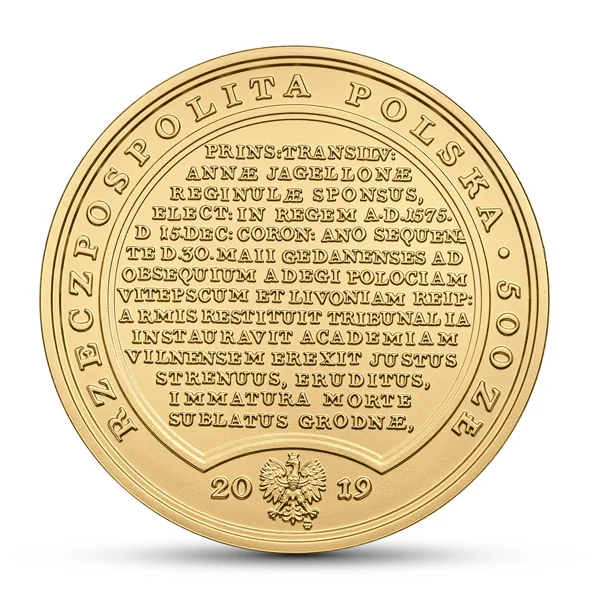PRINS: TRANSILV: ANNAE JEGELLONAE REGINULAE SPONSUS, ELECT: IN REGEM A.D.1575. D 15.DEC: CORON: ANO SEQUEN-TE D.30.MAII GEDANENSES AD OBSEQUIUM ADEGI POLOCIAM VITEPSCUM ET LIVONIAM REIP: A RMIS RESTITUIT TRIBUNAL IA INSTAURAVIT ACADEMIAM VILNENSEM EREXIT JUSTUS STRENUUS, ERUDITUS, IMMATURA MORTE SUBLATUS GRODNAE,