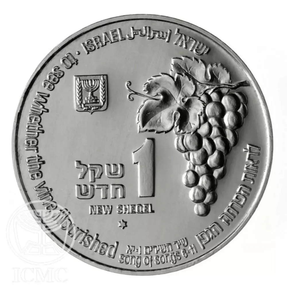 Front: "1 New Sheqel" in Hebrew/English, a grape cluster, and the state emblem.