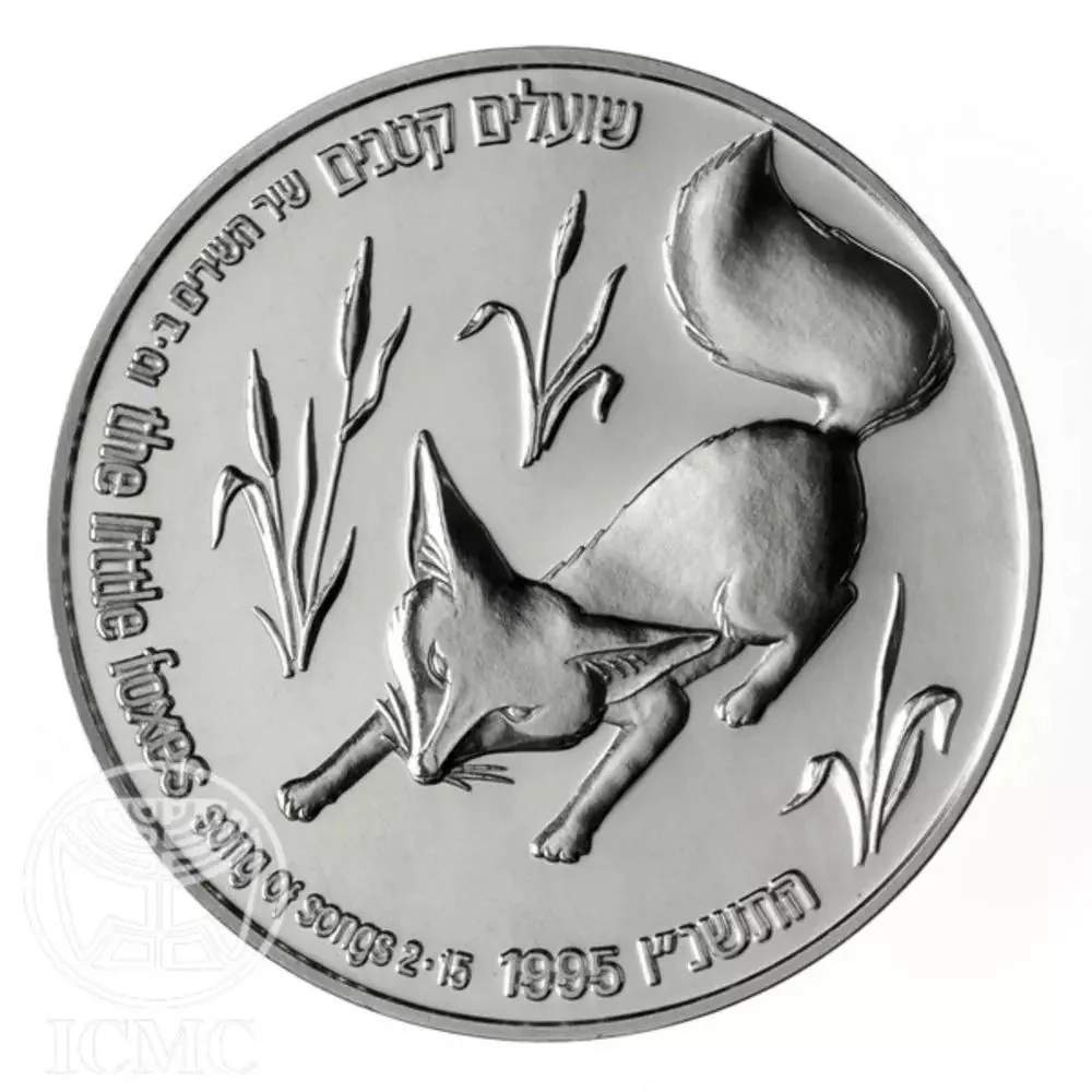 A pouncing Israeli fox. Border text: "the little foxes" with Hebrew and English citation "Song of Songs 2:15" and mint year "1995 / 5756".