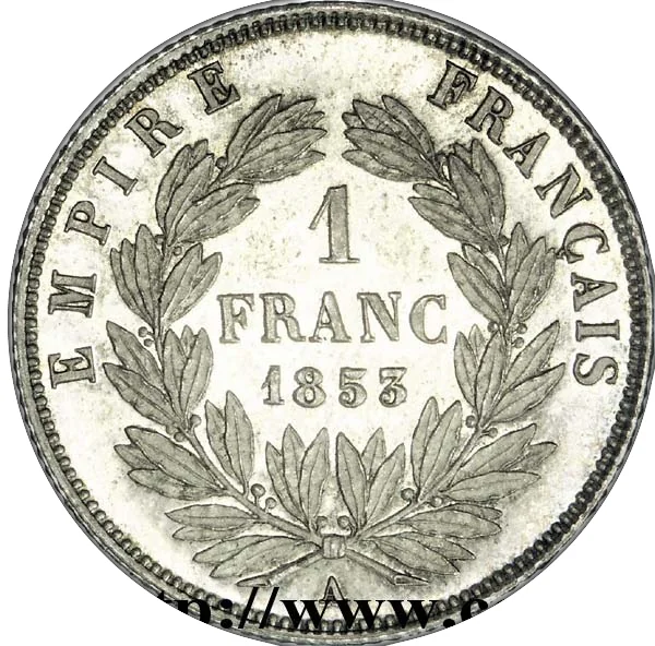1 FRANC above 1853, within a wreath of laurel branches tied below with a studio mark A.