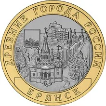 City panorama with Bryansk's coat of arms. Rim inscription: "ДРЕВНИЕ ГОРОДА РОССИИ" (ANCIENT TOWNS OF RUSSIA) above "БРЯНСК" (BRYANSK).