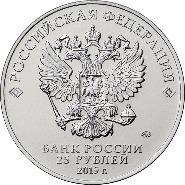 The central relief of the State Coat of Arms. Above it, a semicircular rim inscription: "РОССИЙСКАЯ ФЕДЕРАЦИЯ", flanked by doubled rhombuses. Below, in three lines: "БАНК РОССИИ", "25 РУБЛЕЙ", and "2019 г.", with the mint mark to the right.