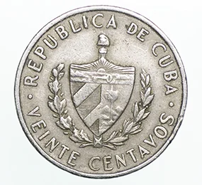 Cuban coat of arms with curved country name above and curved lettered value below.