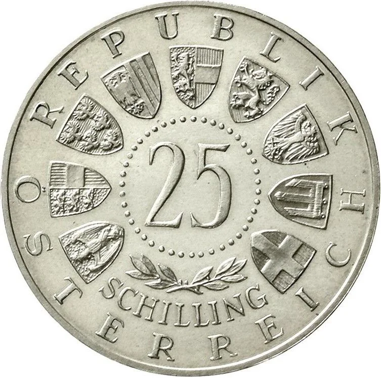 Beaded circle with value, encircled by nine Austrian provincial shields, small sprays below.