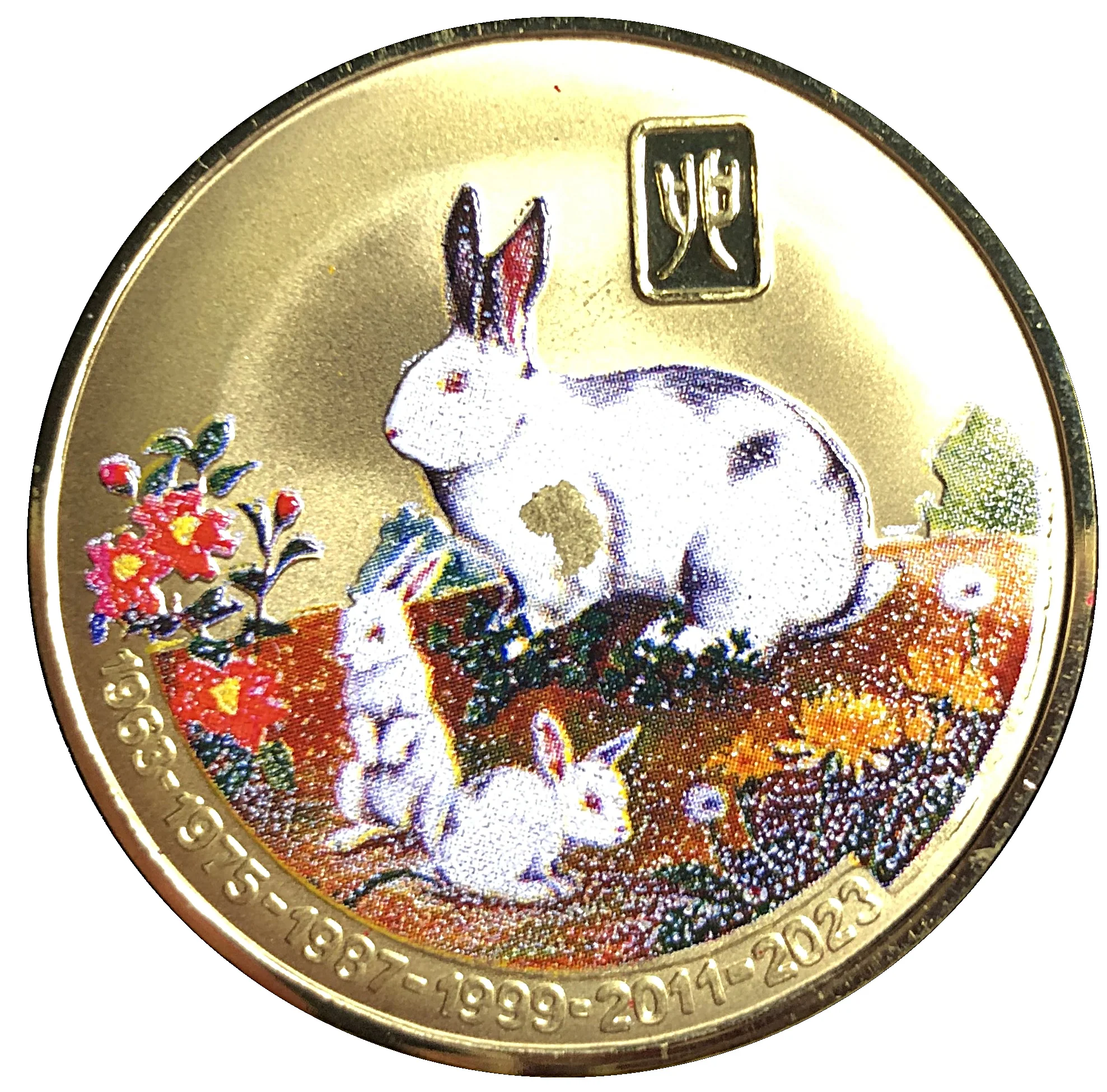 Description: A colorized rabbit with babies on a flowered grass field, above six Rabbit zodiac cycles.