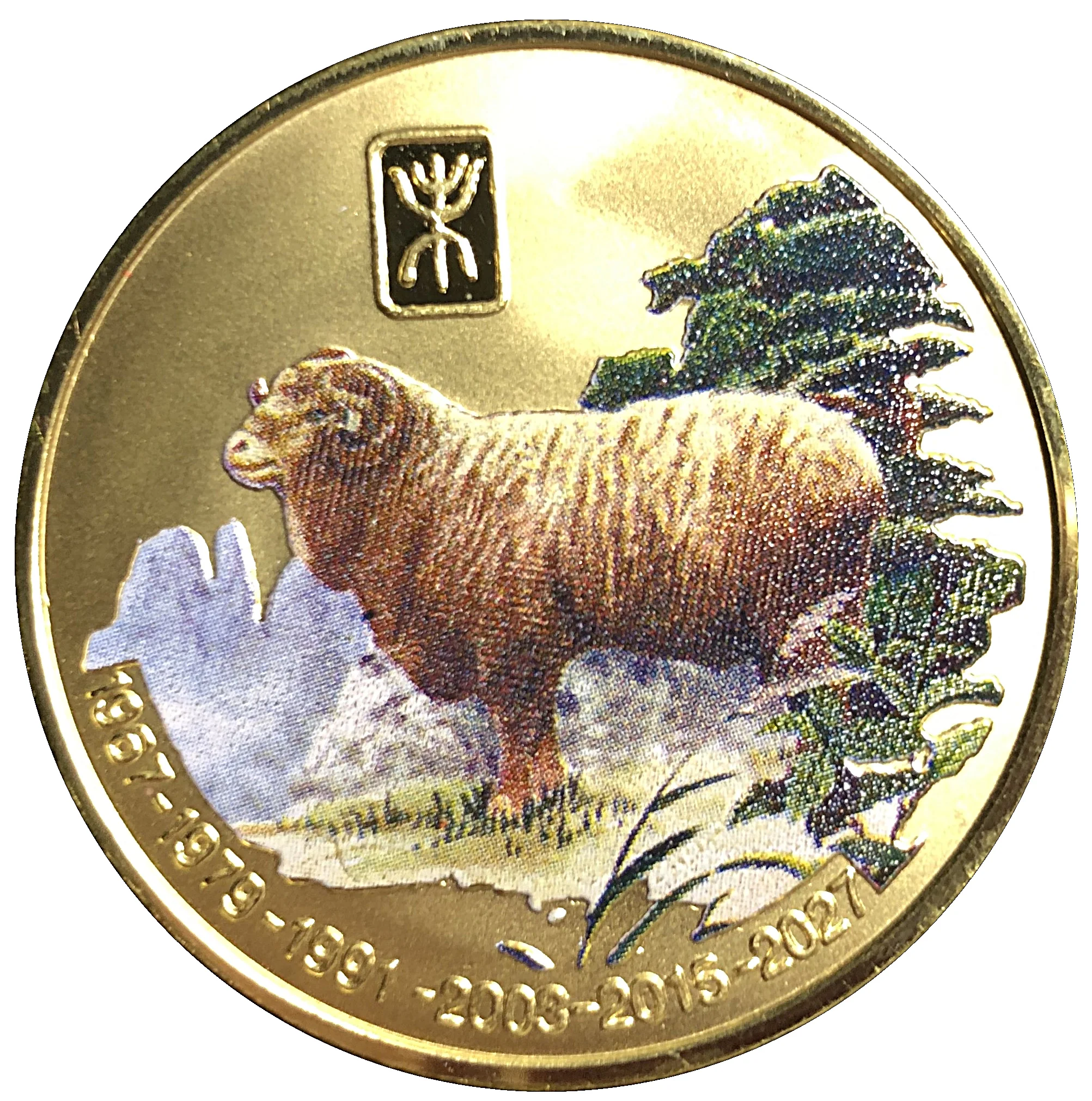 Colored sheep on grass, with mountains and trees. Below: six Goat/Sheep zodiac cycles.