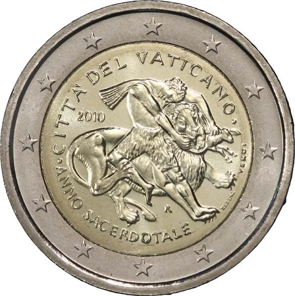 Description: This coin commemorates the Year for Priests (2009-2010), proclaimed by Pope Benedict XVI and concluded with an international gathering. It depicts a shepherd rescuing a lamb from a lion, surrounded by the 12 stars of the European Union.