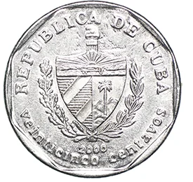 Cuban coat of arms with date below, country name above and face value in words below on a circular legend; eight-sided edge.