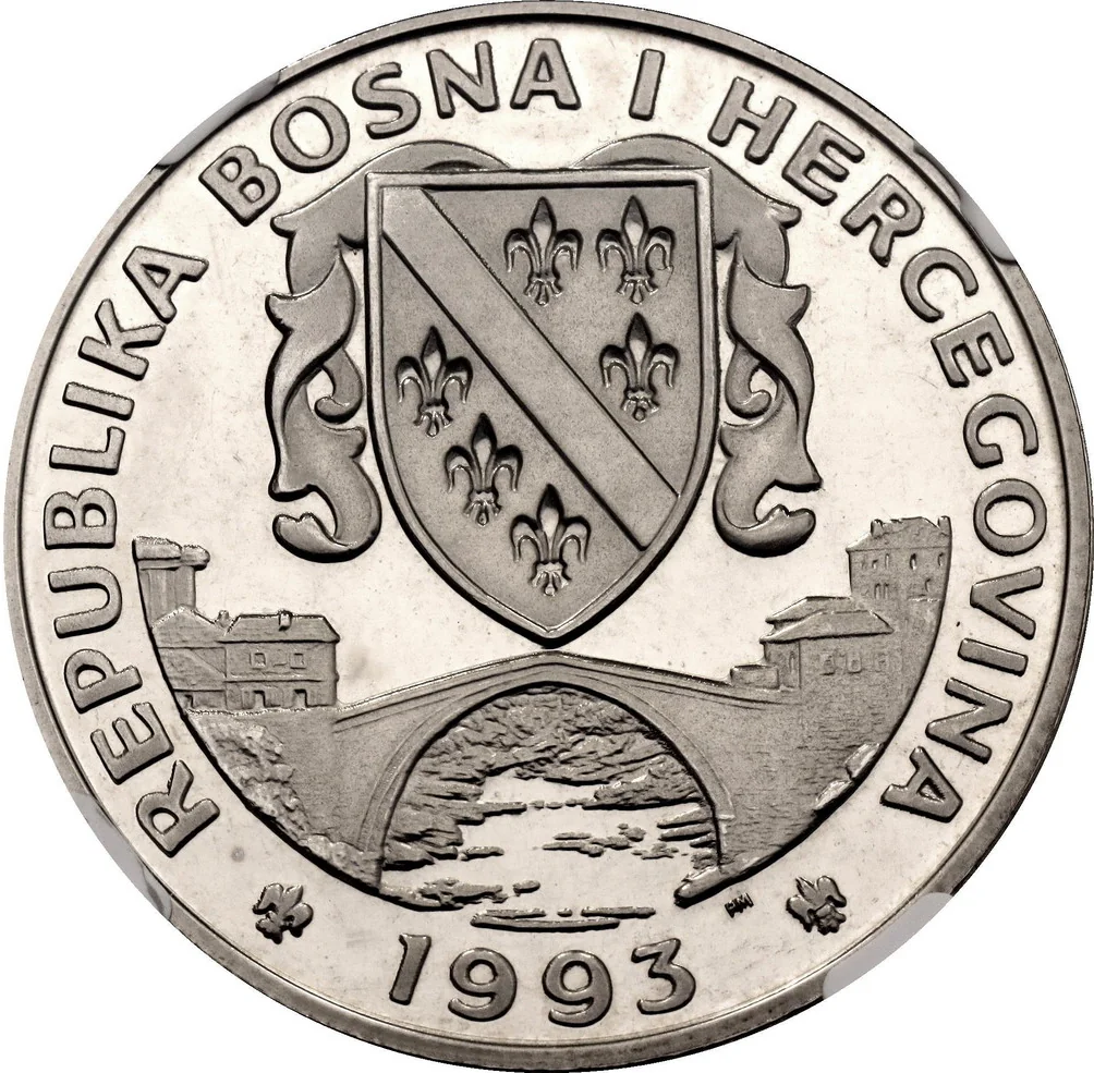 Bosnian emblem above Mostar Bridge; mintmark below bridge, right of date.