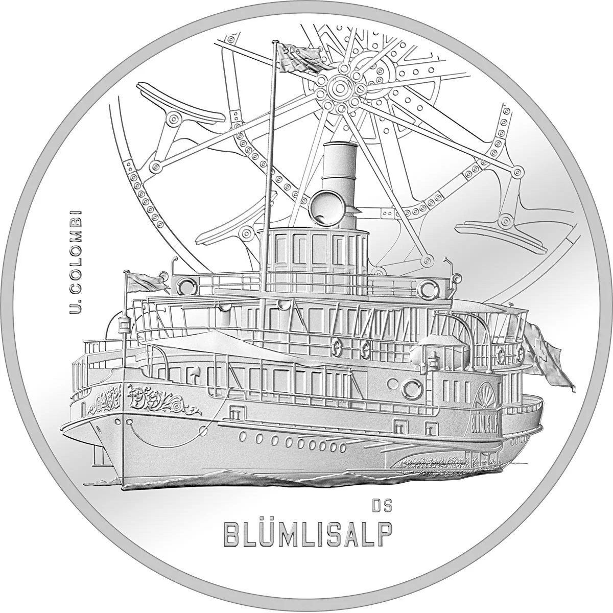 Blüemlisalp paddle steamer moving left, with engine line drawing above.