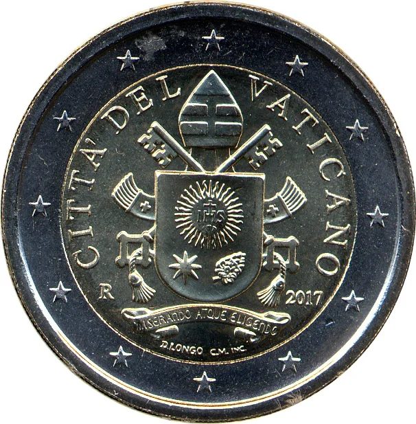 Featuring Pope Francis's coat of arms, the design includes the mintmark 'R' and year '2017' below, surrounded by the 12 stars of the European flag.
